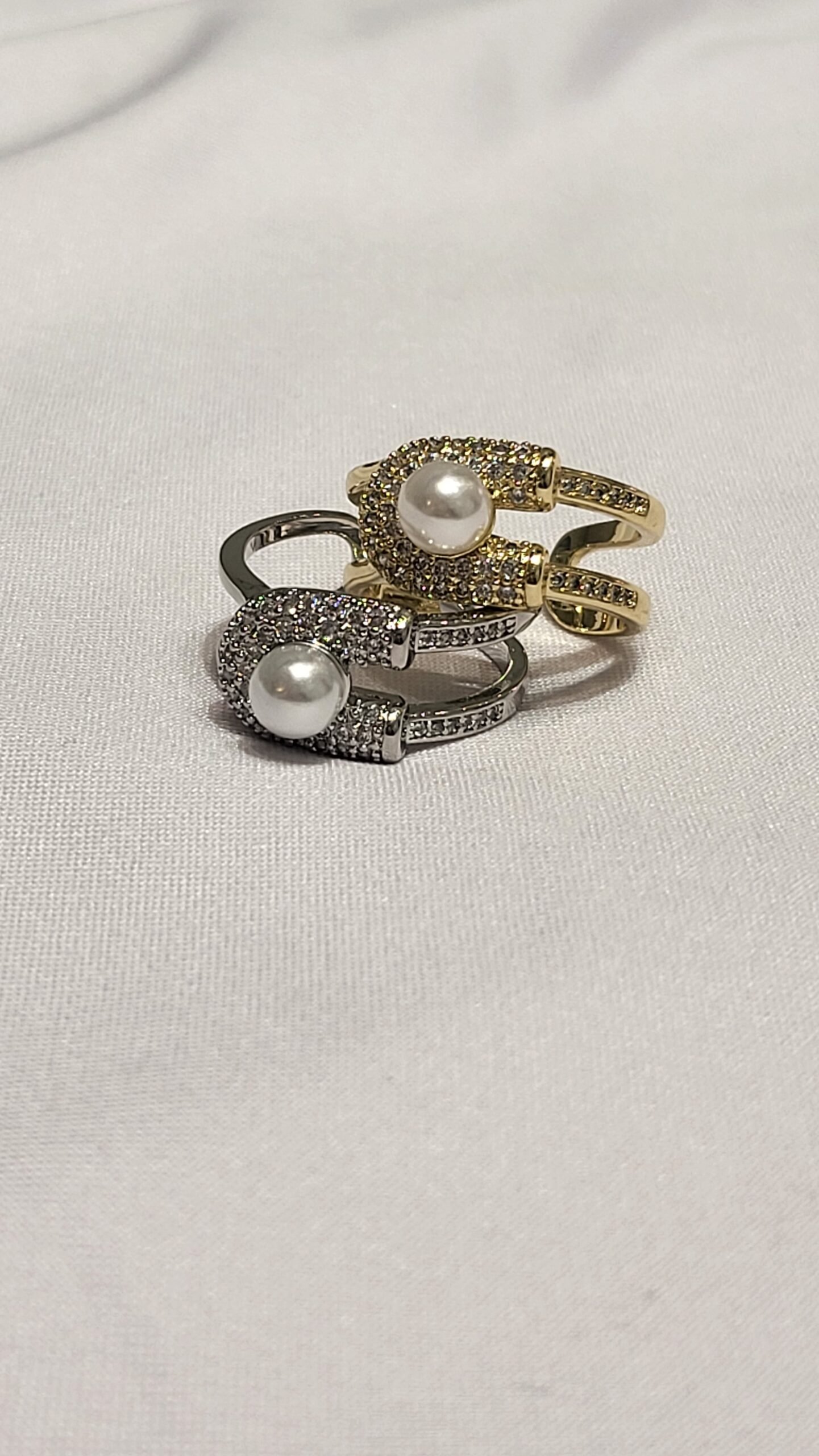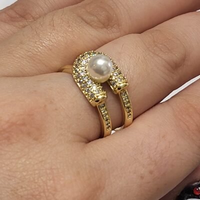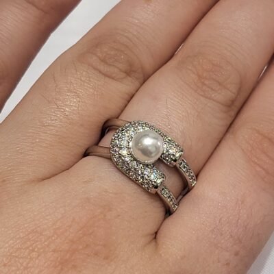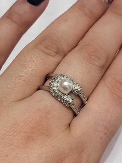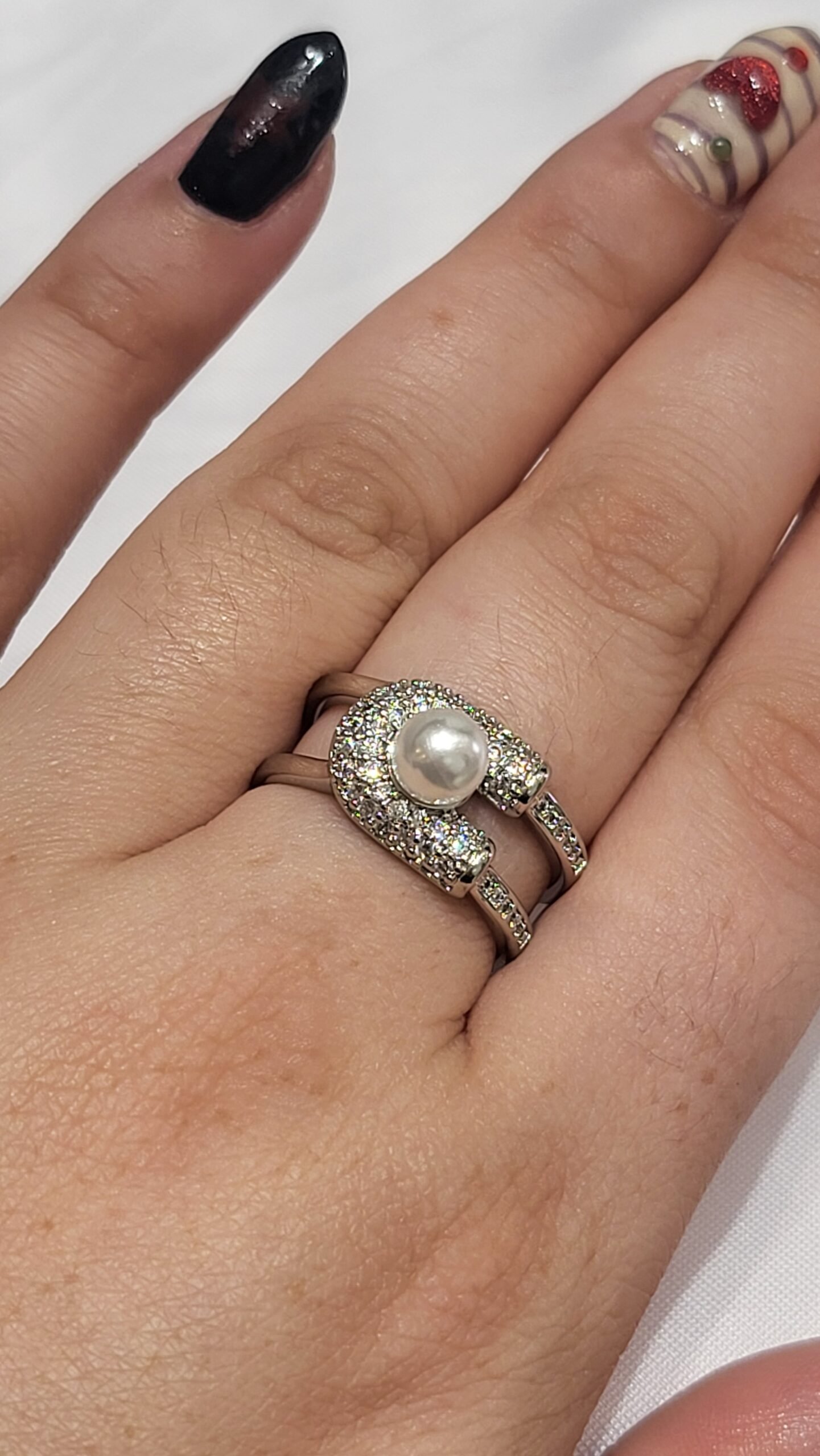 Pavé de Cristales: La superficie frontal y parte de las bandas están recubiertas con un micro-pavé de cristañes o cristales transparentes, con una perla en medio lo que le otorga un brillo intenso y una textura lujosa.
