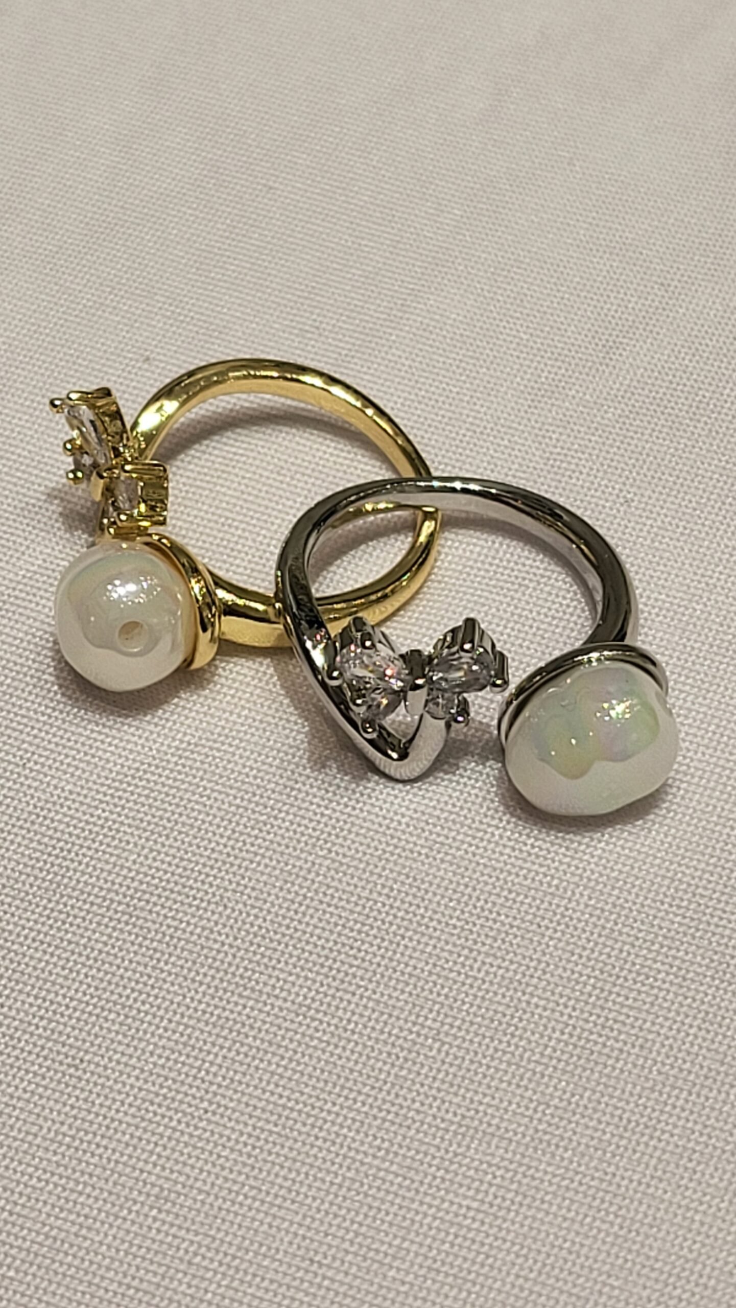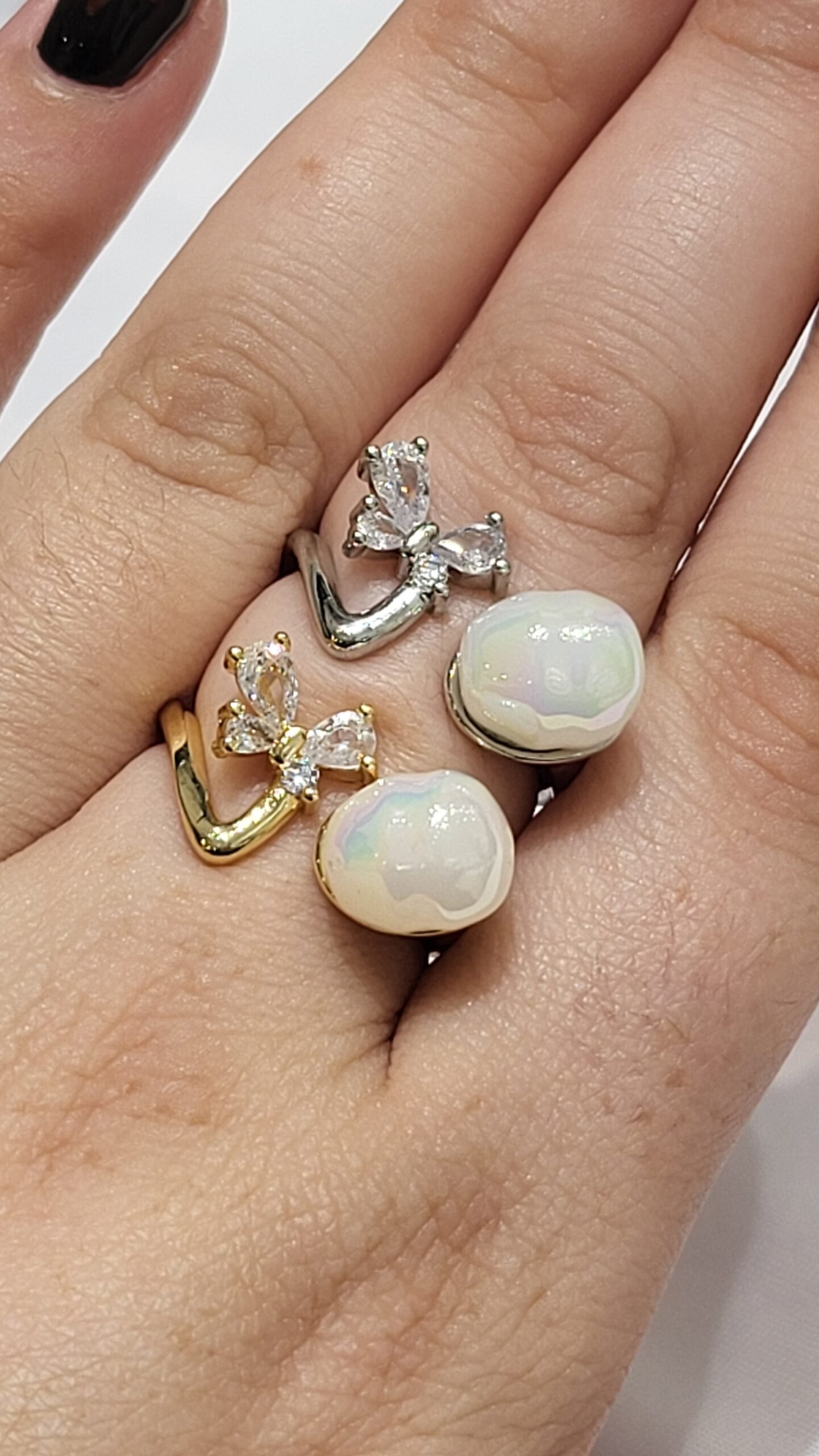 En el otro extremo, una piedra blanca irregular con acabado opalescente o nacarado, que imita la forma de una perla barroca o una piedra lunar.