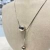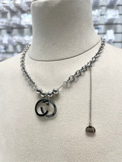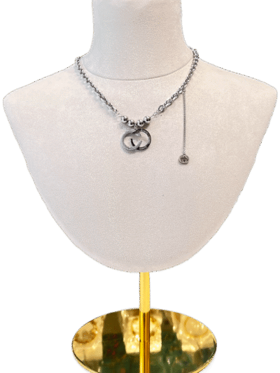Este collar presenta una cadena de eslabones plateados, con un llamativo colgante central de dos aros entrelazados.