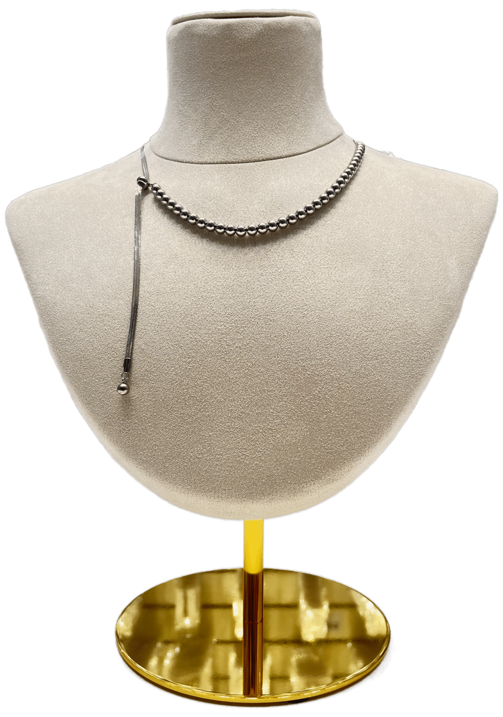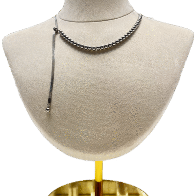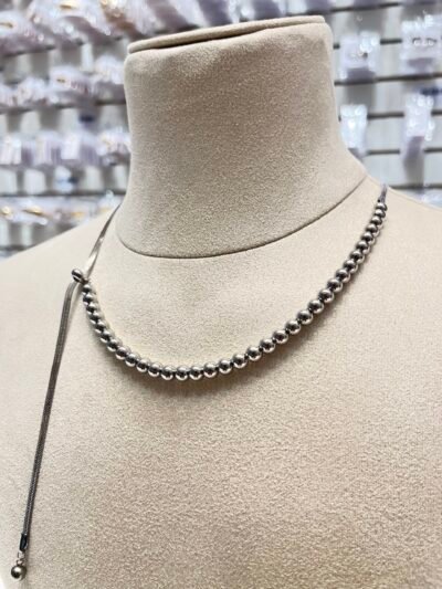 Collar diseño de choker o gargantilla de pequeñas cuentas esféricas de color gris oscuro o metálico, que se ajusta a la base del cuello.