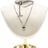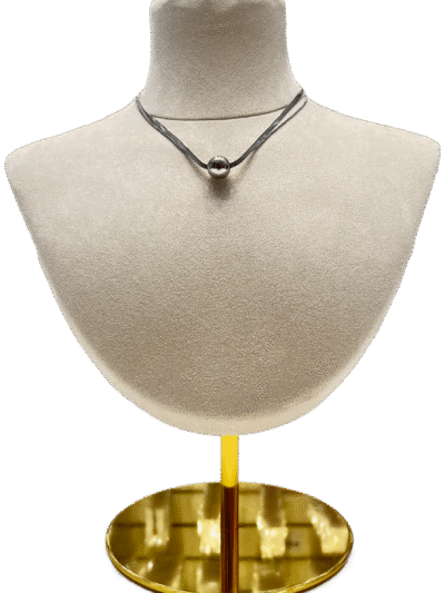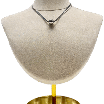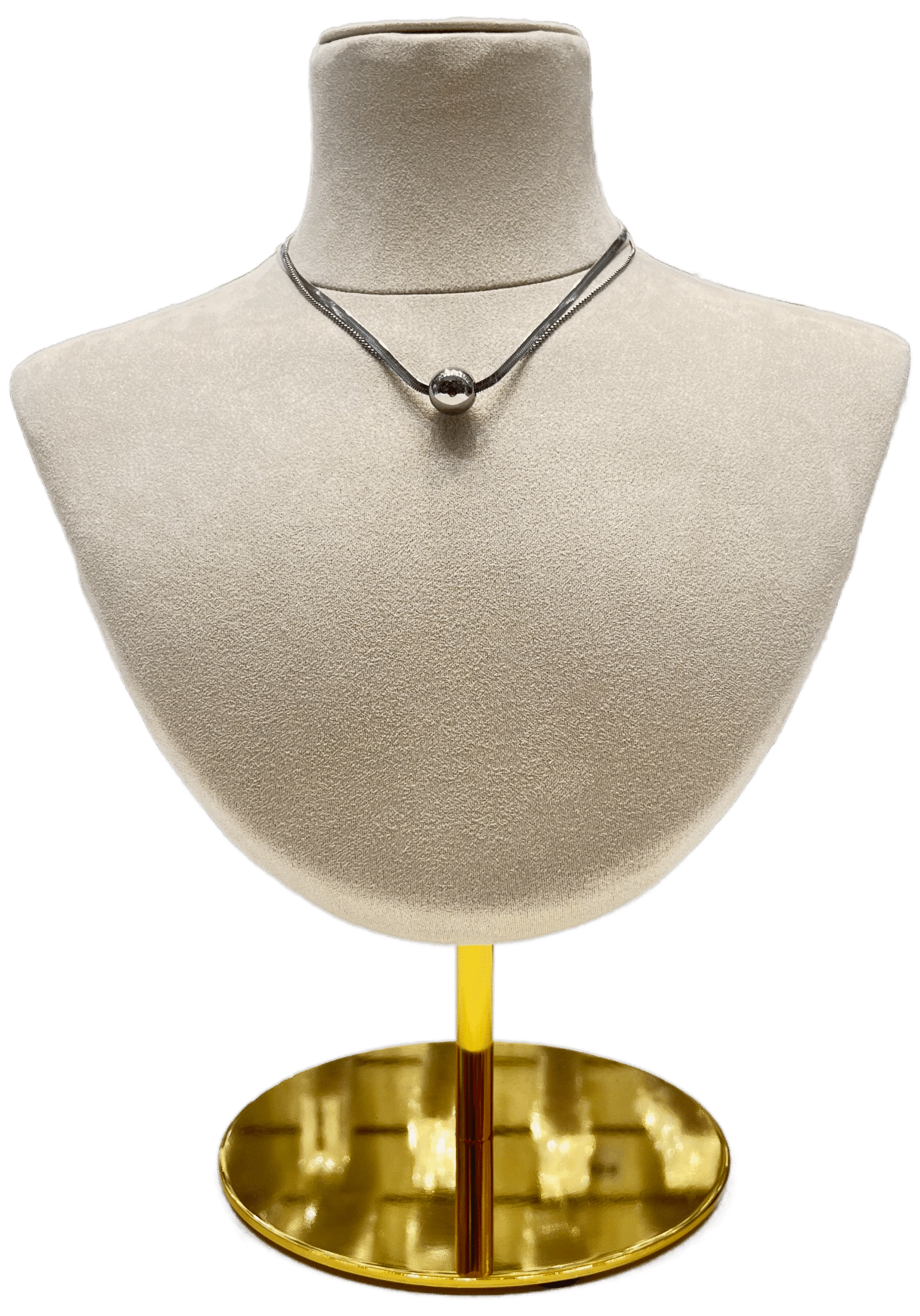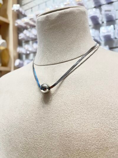 Este es un collar tipo gargantilla de estilo moderno y minimalista, dos cadenas una finita y otra gruesa que se unen con una esfera en medio, el estilo del collar se asemeja a un choker