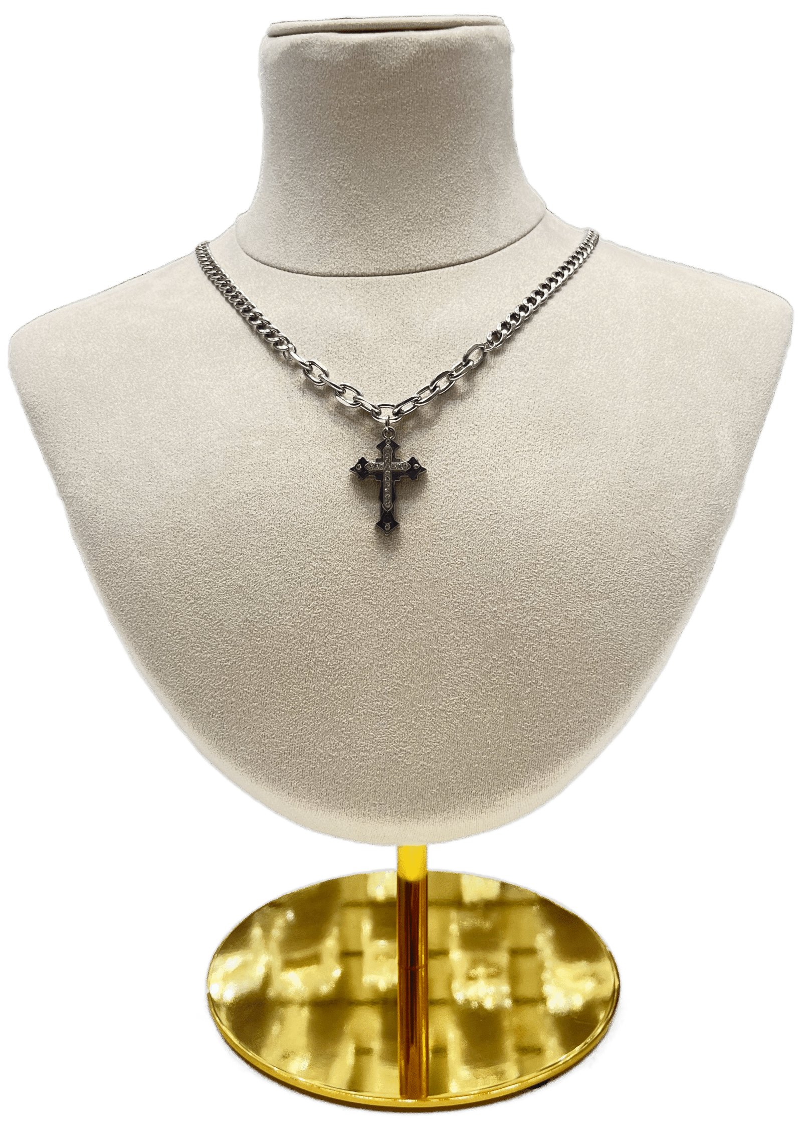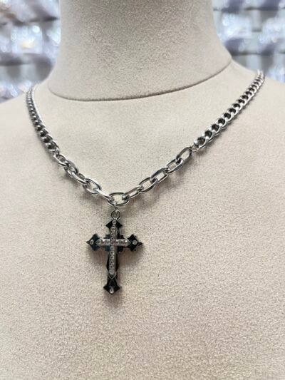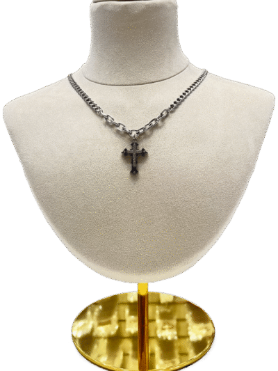Este collar tipo gargantilla de Acero Quirúrgico, La cadena es una combinación de eslabones gruesos y redondeados. El dije es una cruz del mismo color, adornada con pequeñas incrustaciones de cristales que le dan un toque de sofisticación.