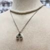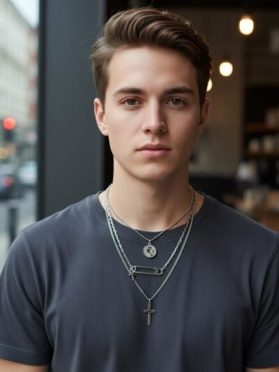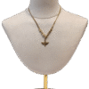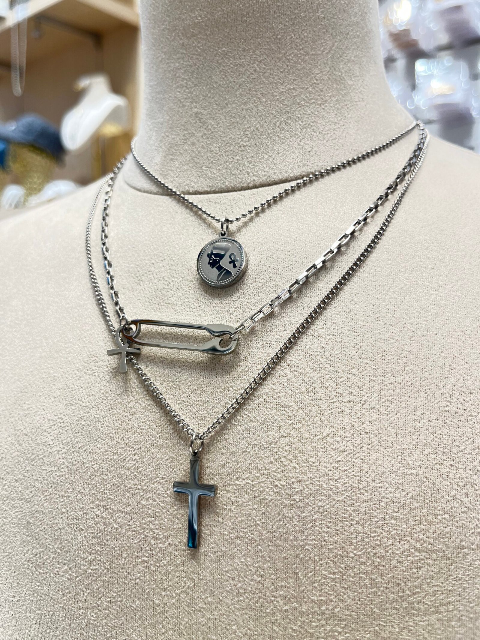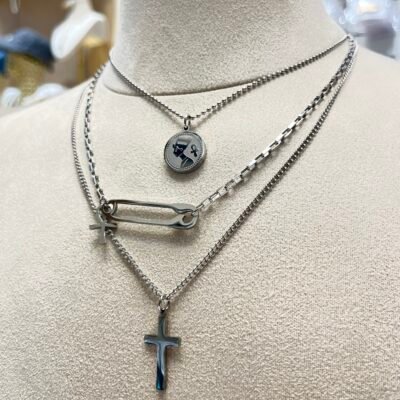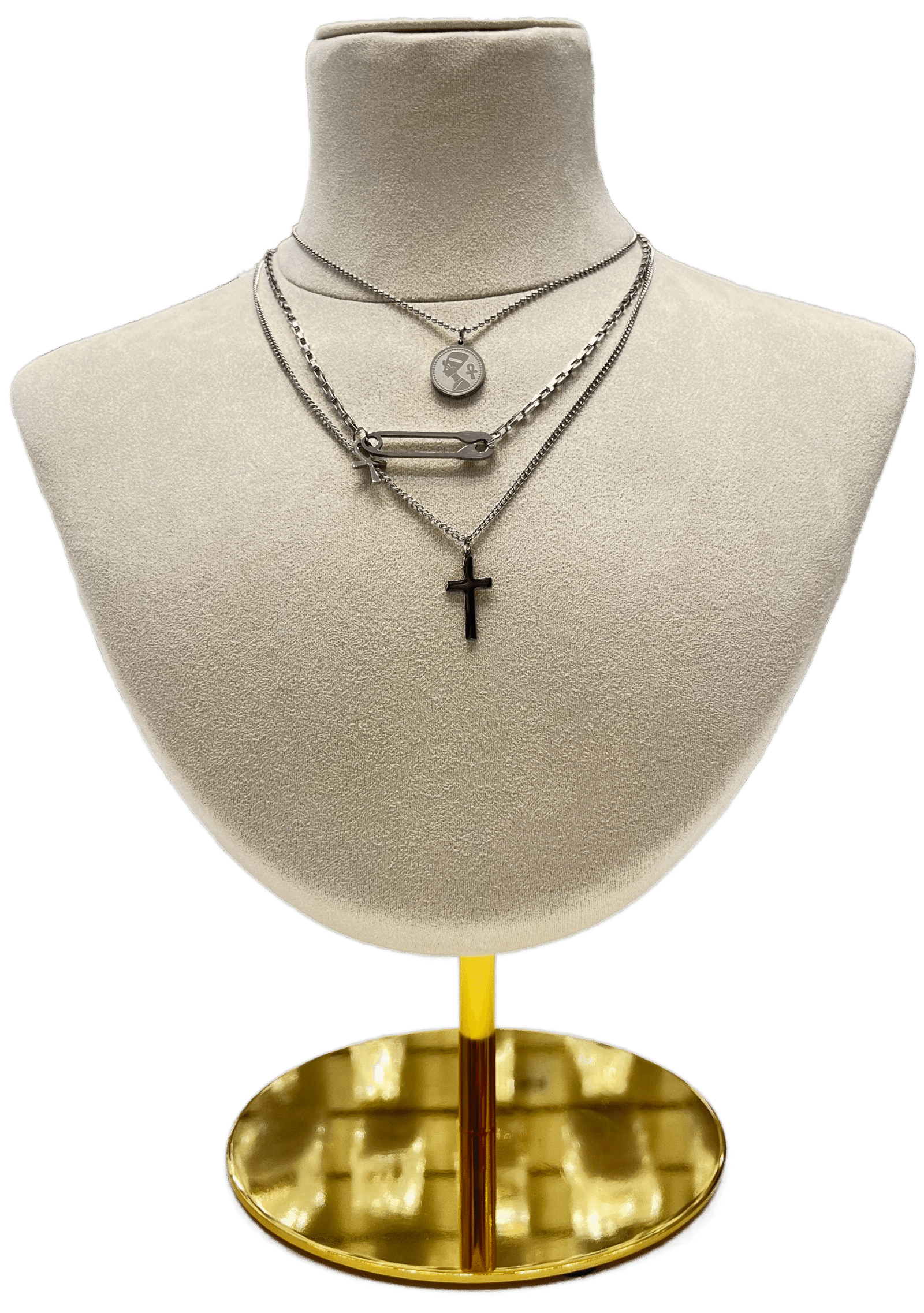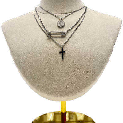 Collar inferior: Es una cadena más larga y fina que termina en un pequeño dije en forma de cruz de color negro.