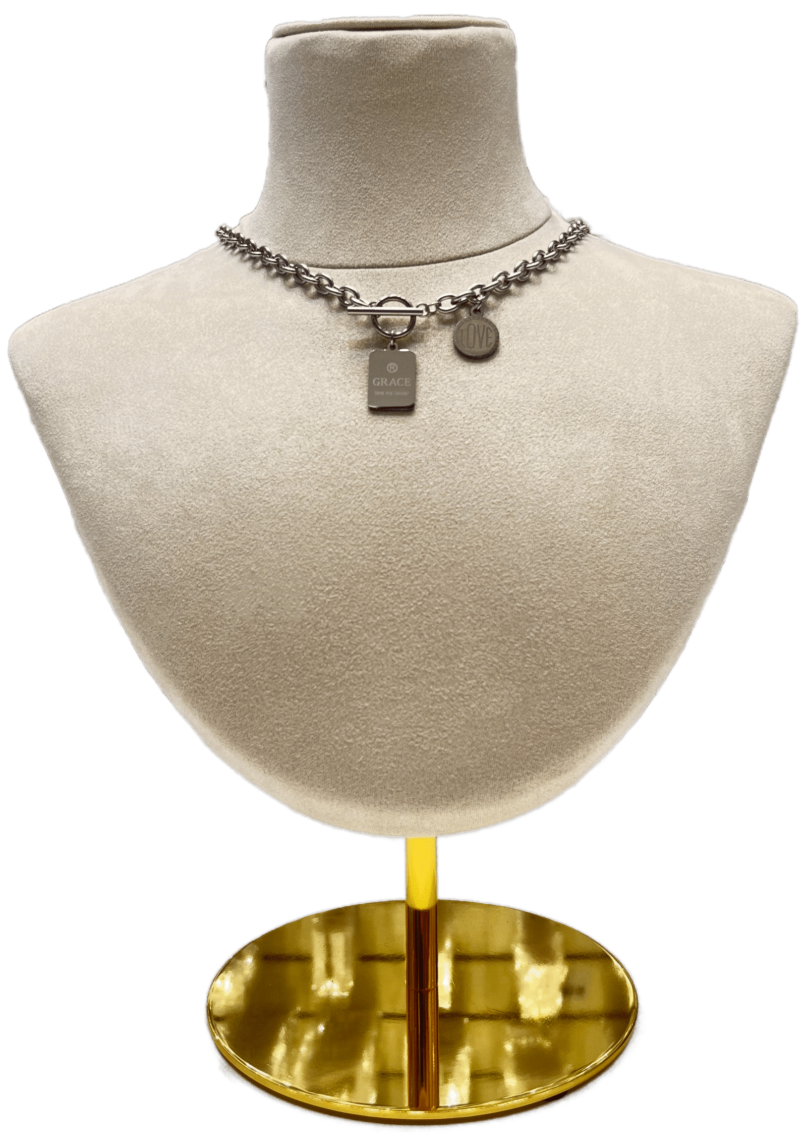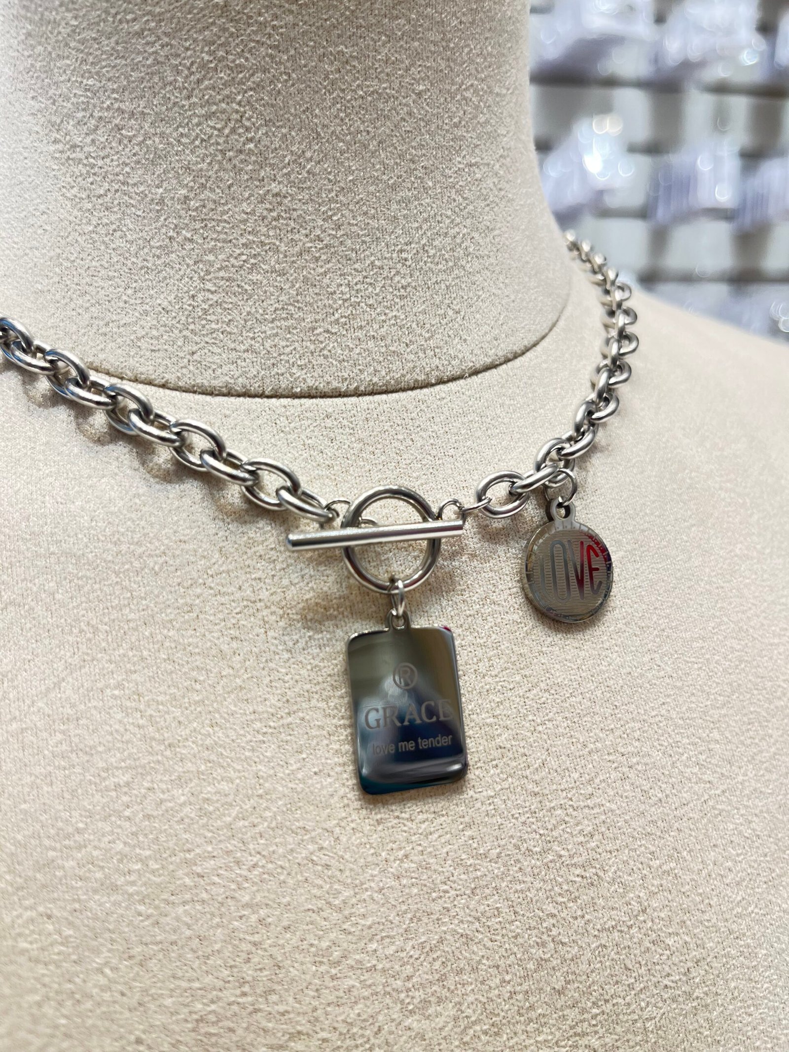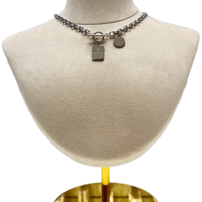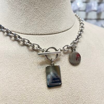 Con dos pequeños dijes cuelgan del cierre: uno es una etiqueta rectangular con la palabra “GRACE” grabada, y el otro es un dije circular más pequeño que parece decir “LOVE”.