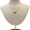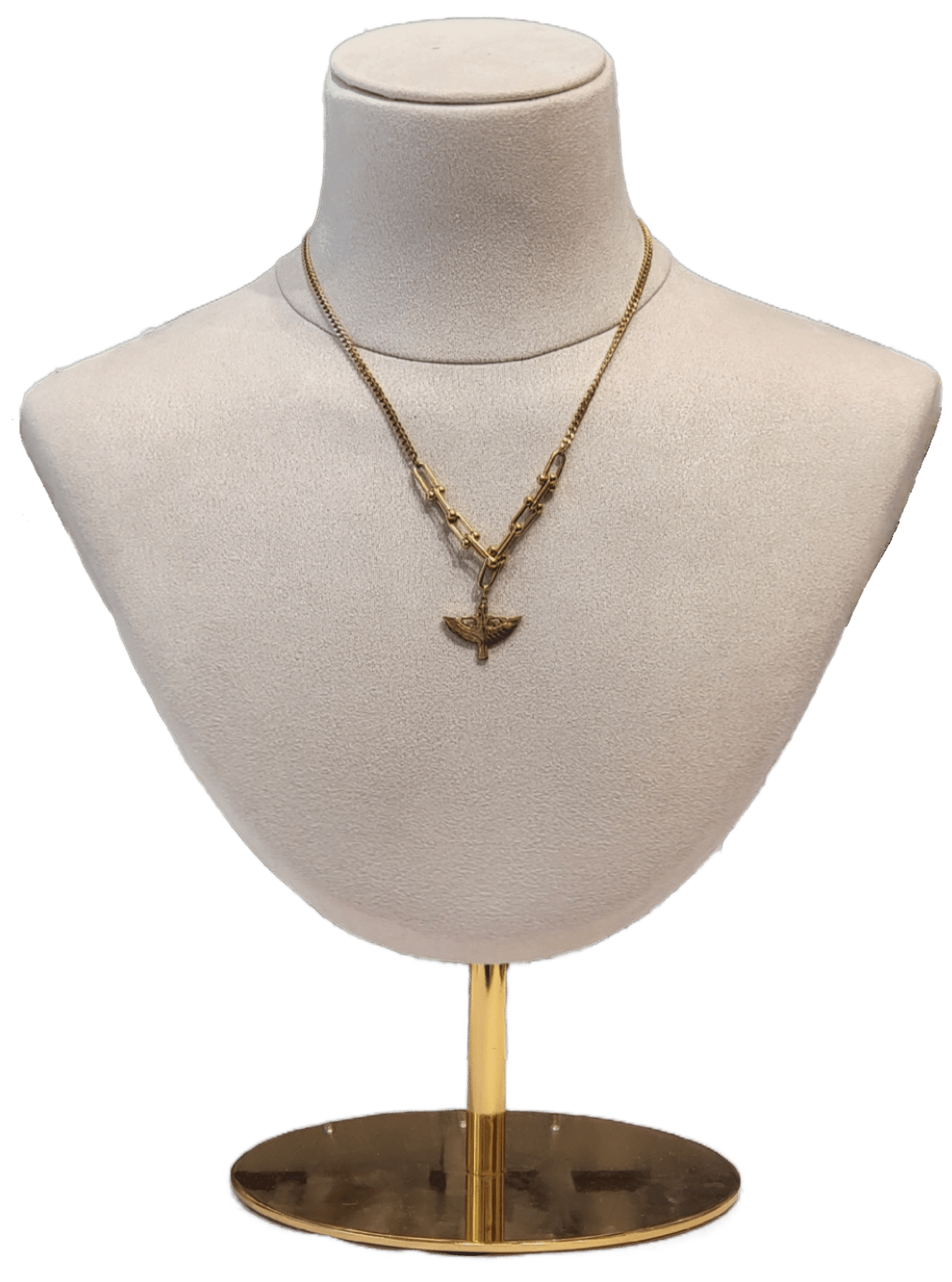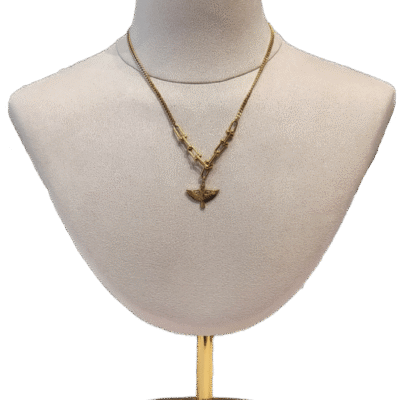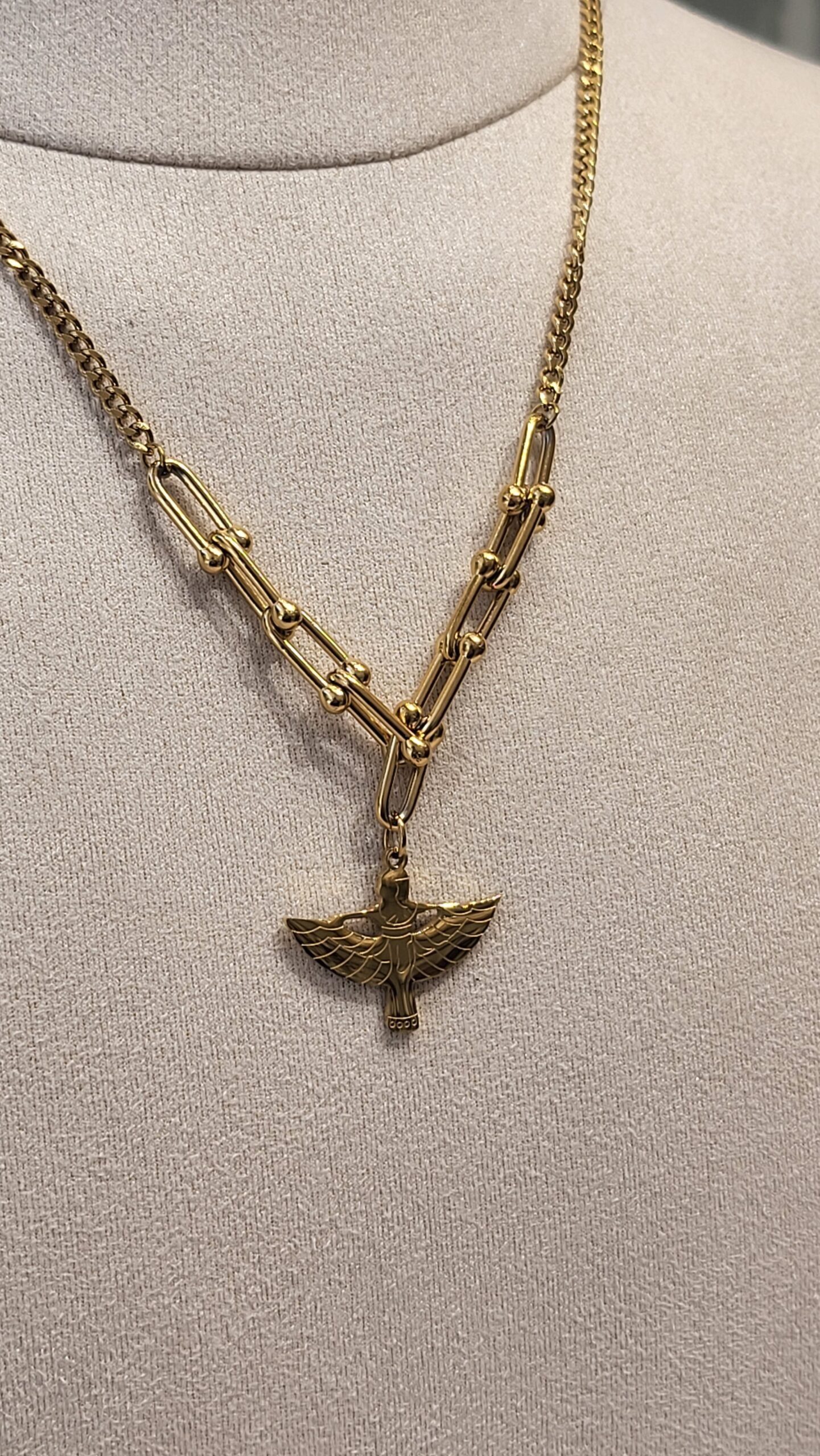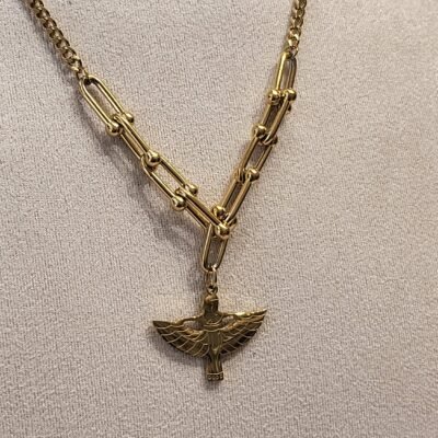 Este es un collar de metal dorado con una cadena de eslabones gruesos y grandes, lo que le da un aspecto moderno y llamativo. El dije es un colgante con la forma de un águila o un ave con las alas extendidas.