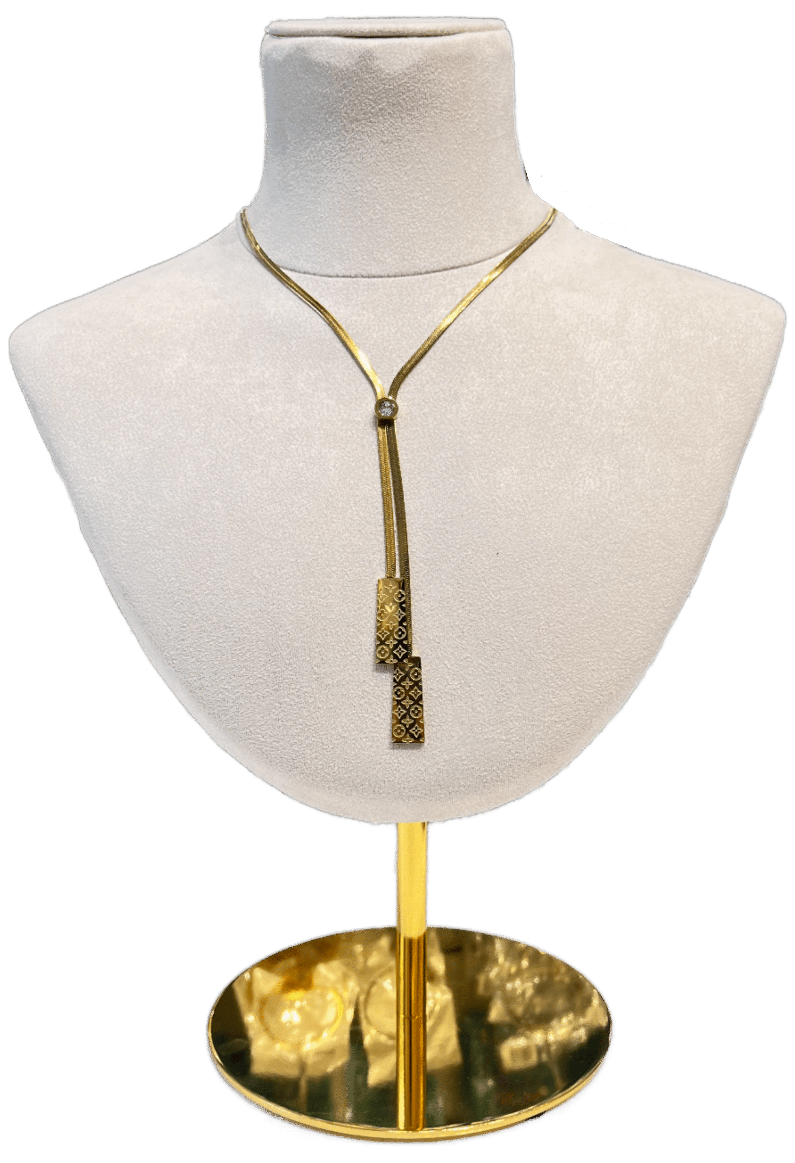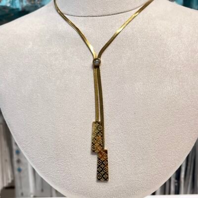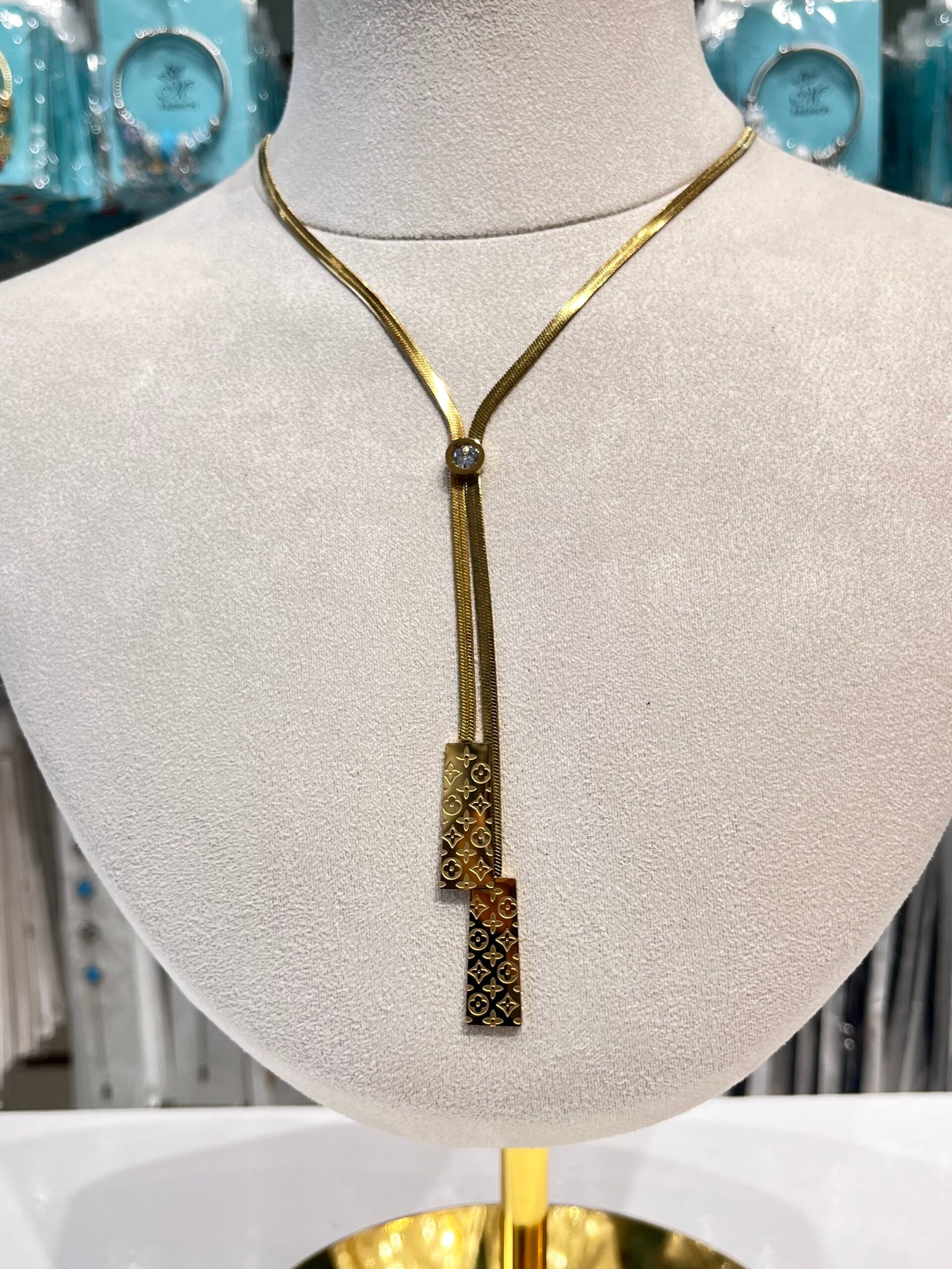 El accesorio es un collar tipo lazo de color dorado. Está compuesto por una cadena delgada y una pieza central que se desliza por ella, formando un nudo decorativo.