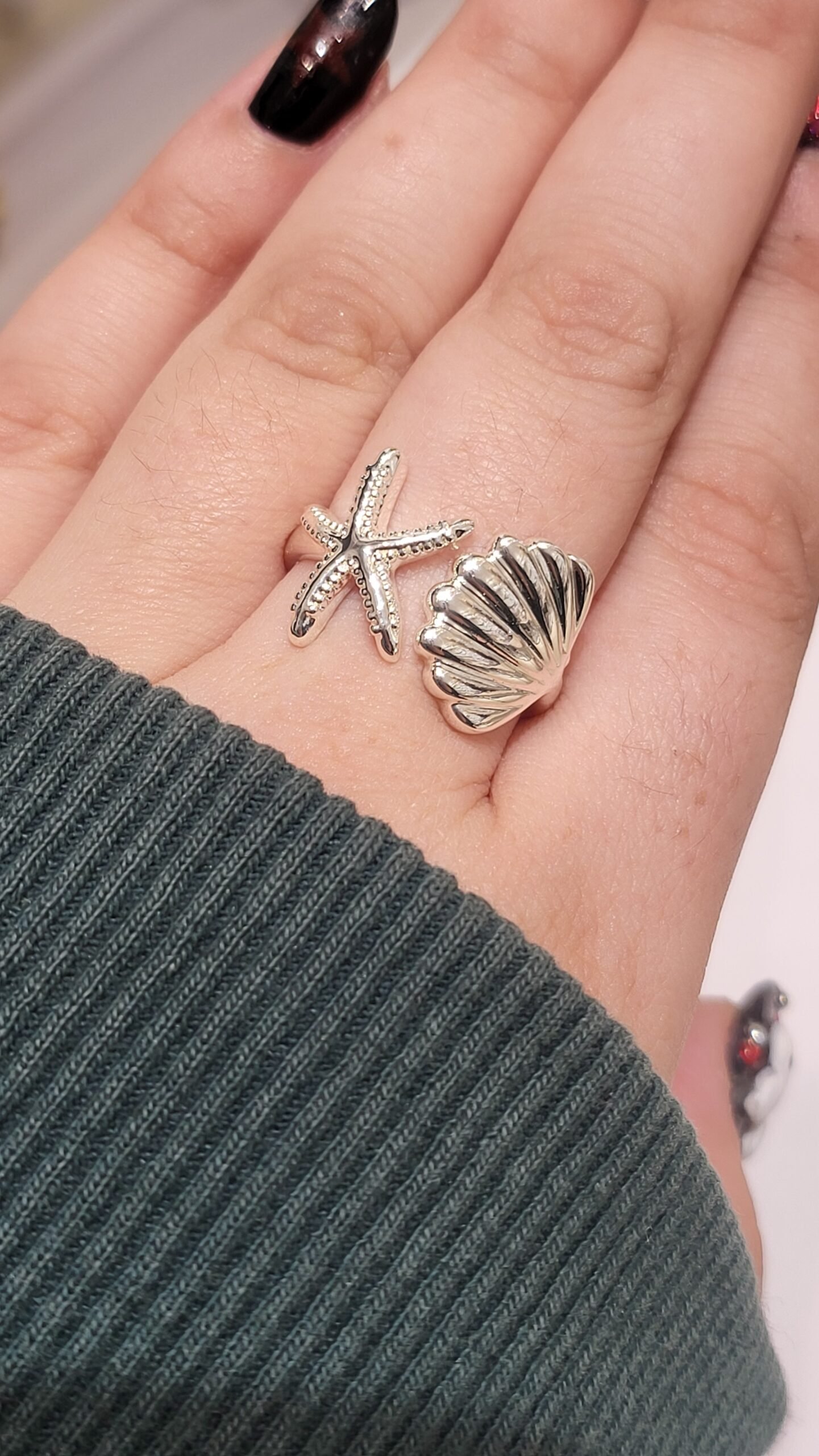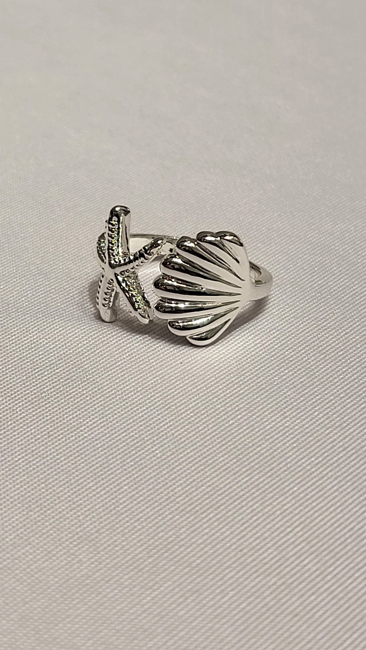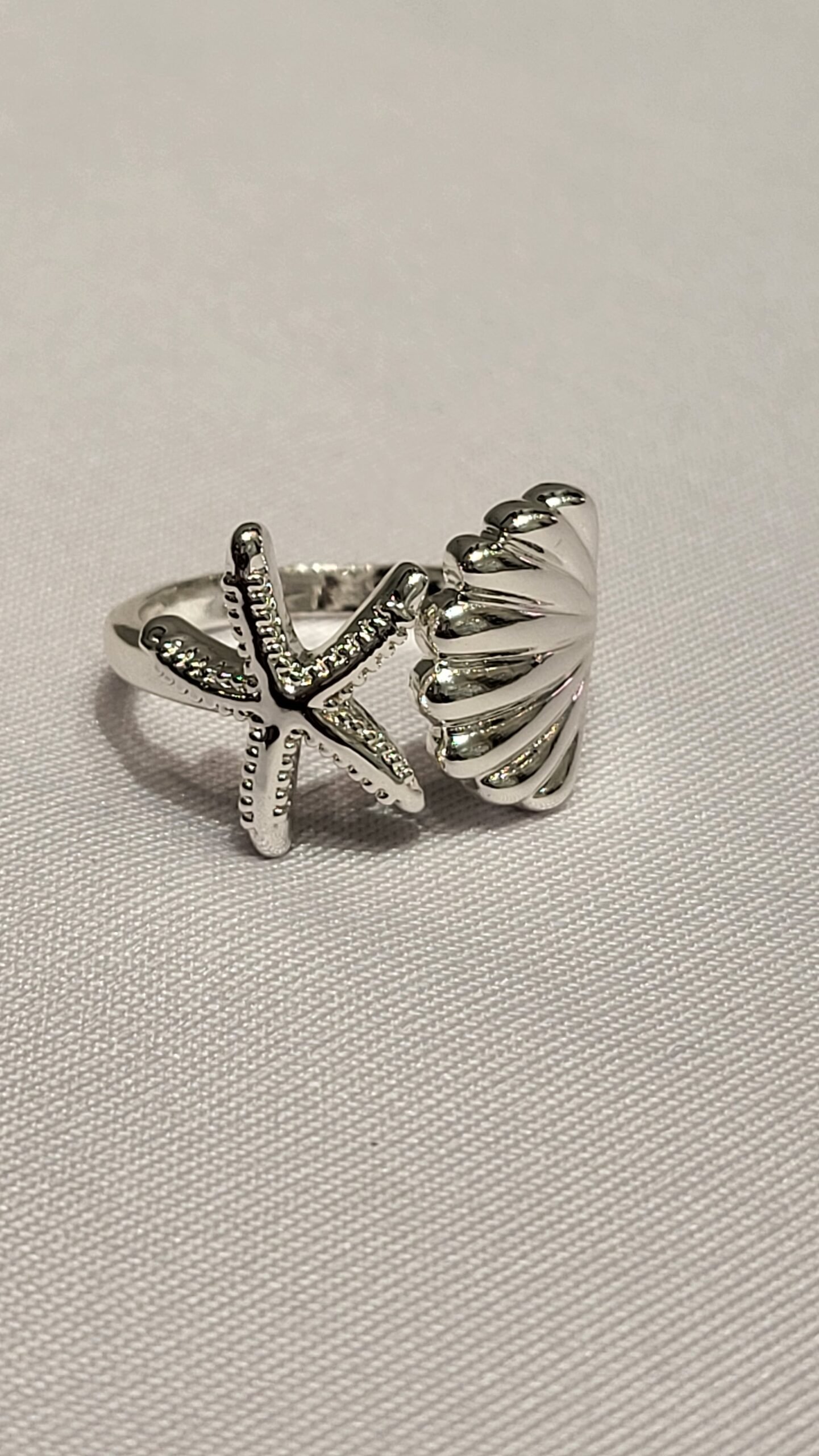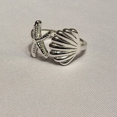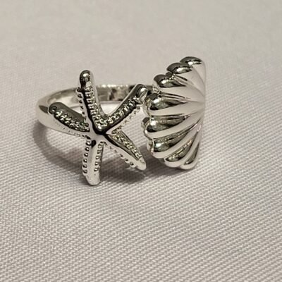 Motivo Dual: La pieza combina dos figuras centrales en un estilo “bypass” o abierto: una estrella de mar con texturas punteadas y una concha de mar (vieira) con relieves radiales clásicos.