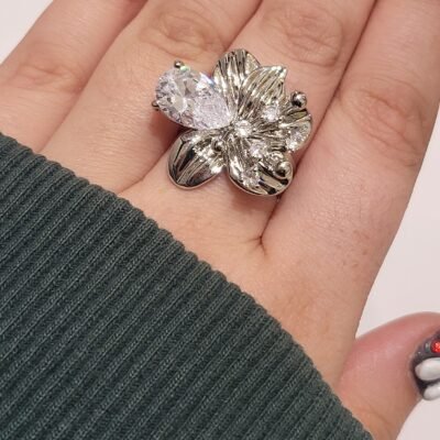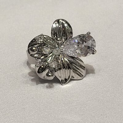 Motivo Floral Orgánico: El anillo presenta una estructura de pétalos esculpidos en metal plateado con un acabado de alto brillo. Los pétalos tienen una textura acanalada que aporta profundidad y realismo a la pieza.