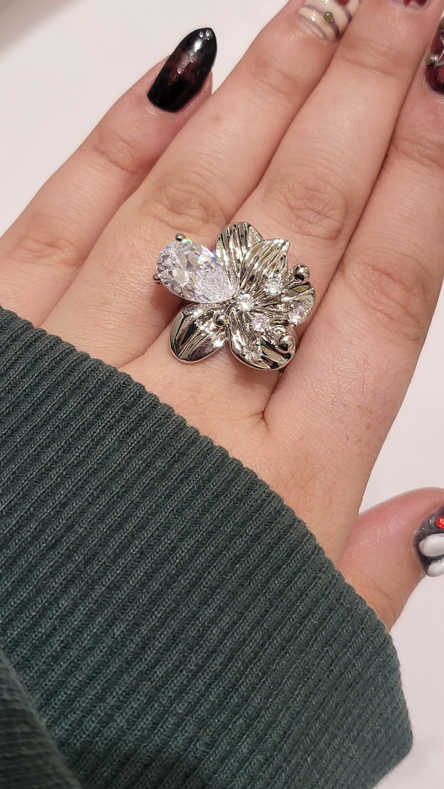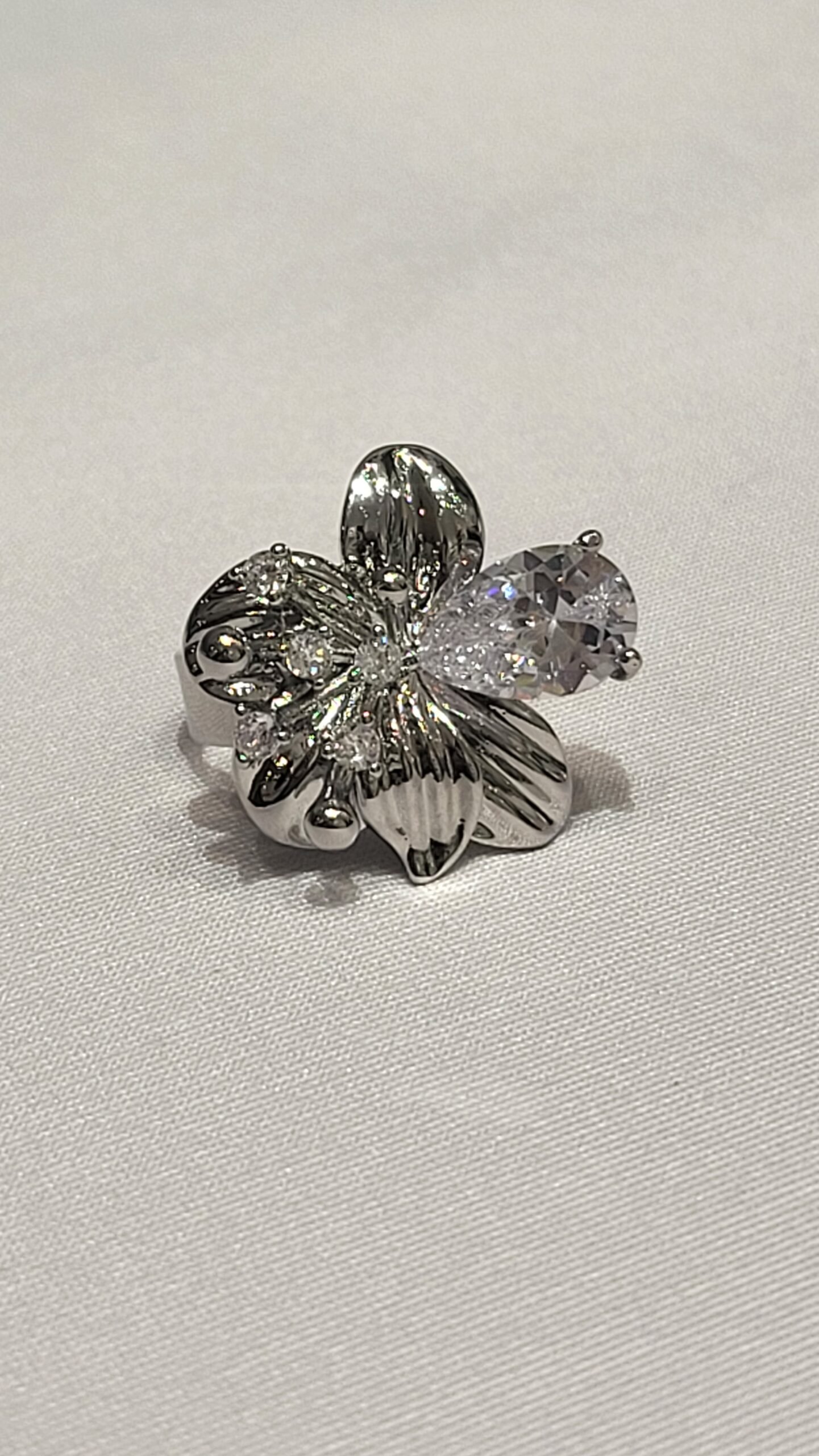 Detalle de Piedra Principal: Sobresale una gema de cristal transparente con un corte de pera (o gota), que imita un pétalo de cristal o una gota de rocío, añadiendo un toque asimétrico y sofisticado.