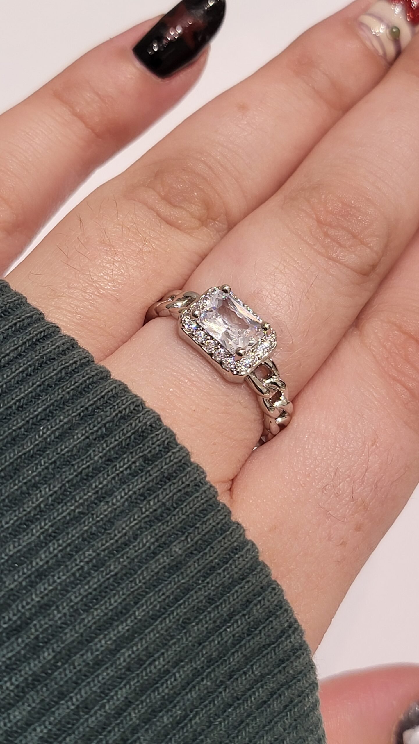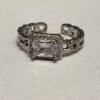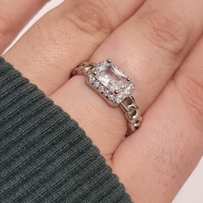Piedra Central: Presenta una gema de cristal transparente con talla esmeralda (rectangular), conocida por su claridad y elegancia atemporal.